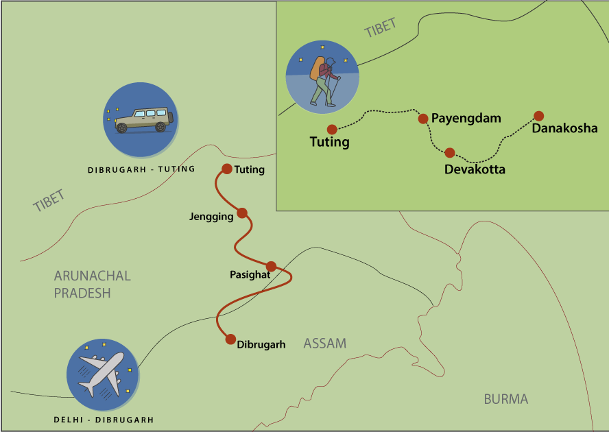 | BEYUL OF PEMAKO This year pilgrimage take place in the most extraordinary place of the world, the most sought-after, revered and mysterious of all the hidden lands, The Beyul of Pemako, the "hidden land shaped in the form of a lotus", which is the physical form of Vajravarahi, known in Tibetan as Dorje Pagmo. Ancient tibetan texts describe it's location as the region that covers South Tibet and Arunachal Pradesh in India. The Tsangpo River (Brahmaputra in India) is said to be the spine of Dorje Pagmo and the surrounding remote mountains form other parts of her body. The lower part of her body lies in Yangsang or the innermost Pemako, which is the Upper Siang region of Arunachal Pradesh. The most beautiful of which are the peaks of Namcha Barwa and Gyala Pelri which are her breasts. |